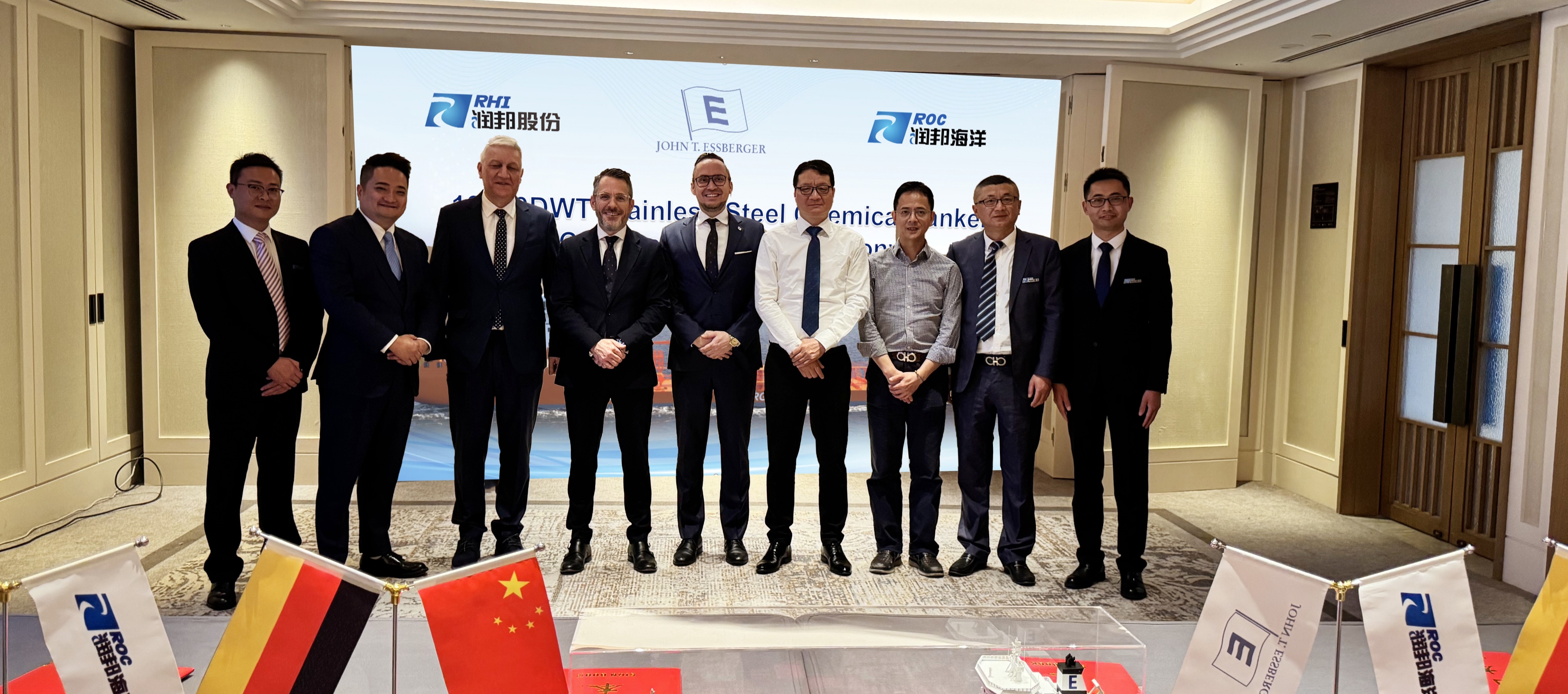 繼去年簽署2艘13,000載重噸雙向不銹鋼化學品船后,近日,子公司潤邦海洋在上海成功舉行了DAL/Essberger集團后續2艘選擇船合同的簽約儀式。本次簽約進一步加強了雙方在不銹鋼化學品船領域的全面合作。執行董事Johan Isaksen、Ricardo Alvarez,Link Marine負責人 Safa, 潤邦股份總裁吳建,潤邦海洋總經理邵夕吾、常務副總方如意、副總經理任偉等領導出席了本次簽約儀式。