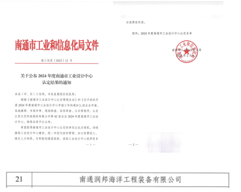 近日,南通市工業(yè)和信息化局公布2024年度南通市工業(yè)設(shè)計中心認定結(jié)果的名單,子公司潤邦海洋經(jīng)過專家評審、現(xiàn)場核查、征信審查等程序,最終被認定為2024年度南通市工業(yè)設(shè)計中心。此次設(shè)計中心的認定是對潤邦海洋創(chuàng)新能力、設(shè)計水平及服務(wù)...